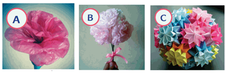 Buatlah karya hiasan berupa bunga dari bahan-bahan buatan. Rencanakan karyamu bersama teman di sebelahmu. Tentukan bahan-bahan yang akan digunakan. Bahan-bahan yang digunakan, misalnya sedotan minuman, kertas lipat, kertas tisu, atau plastik warna-warni. Tentukan alat-alat yang digunakan, misalnya gunting dan lem.